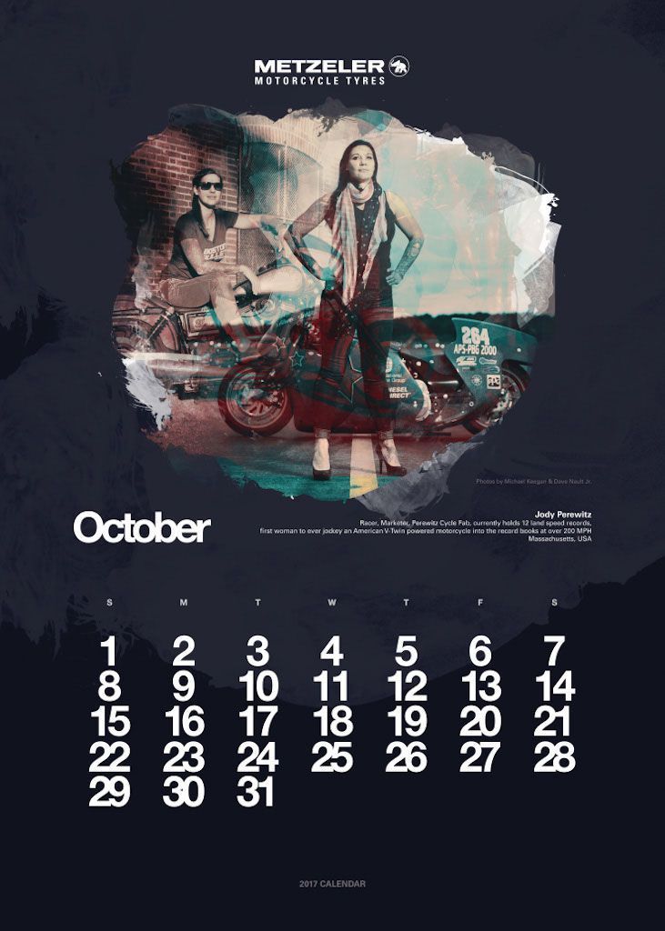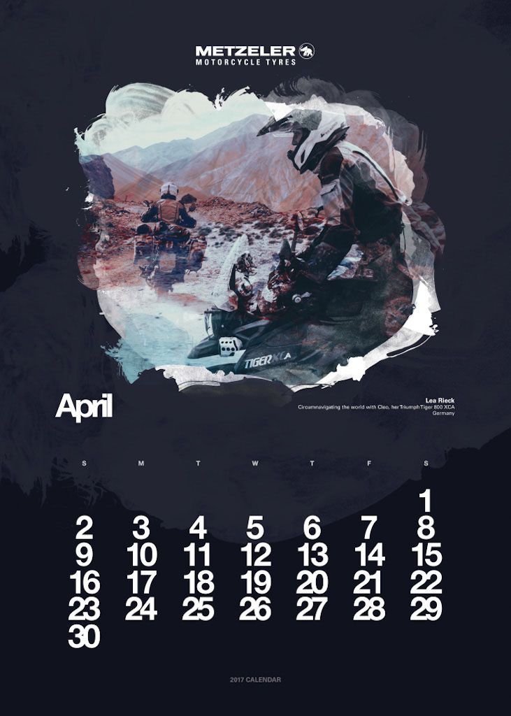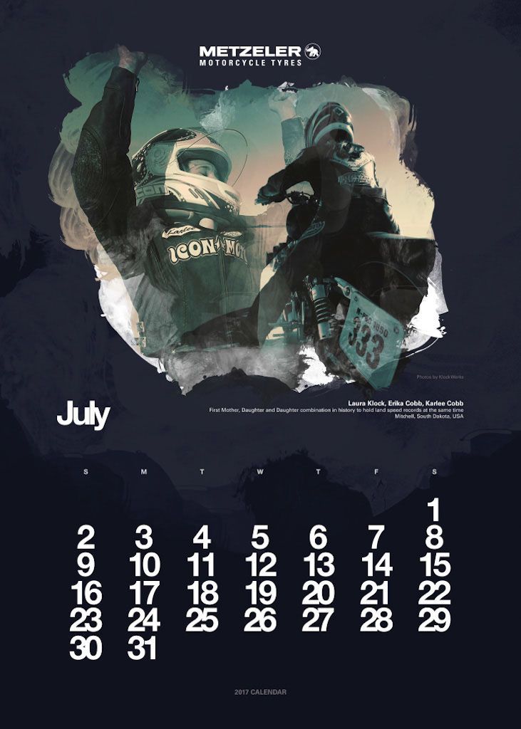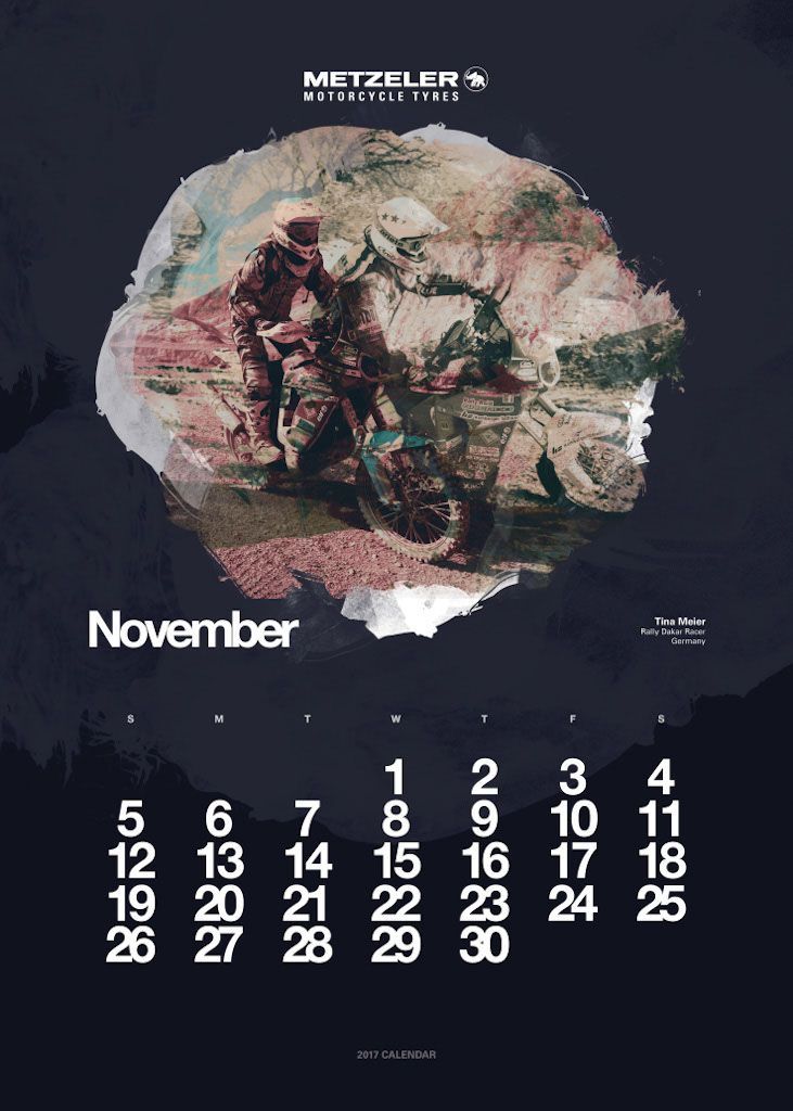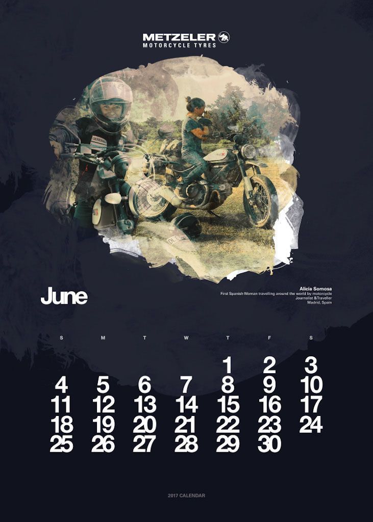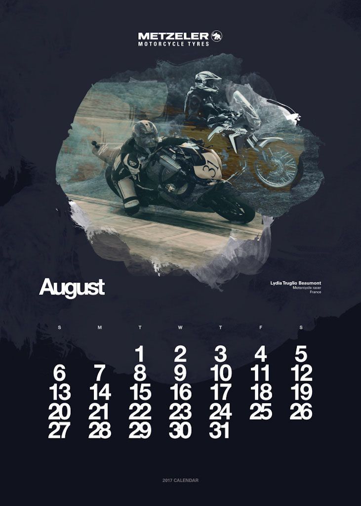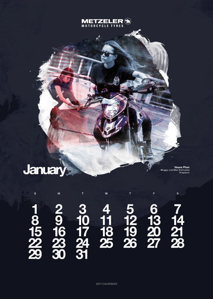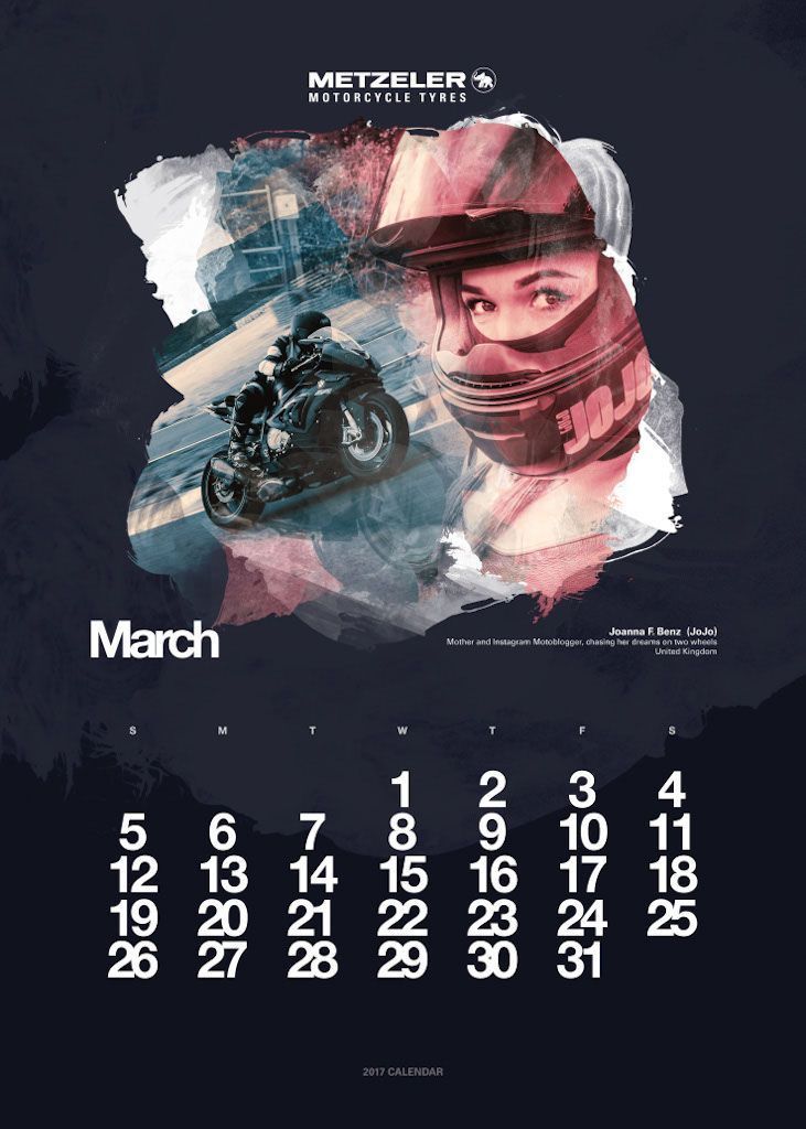 L’anno si apre con Vaune Phan, blogger di Singapore, e protagonista del mese di gennaio, seguita dalla bionda regina delle road races, Maria Costello, motociclista professionista che può vantare tre podi conseguiti sulle leggendarie strade dell’Isola di Man. A Joanna Benz, motoblogger britannica molto attiva sul social network Instagram, è dedicata la pagina di marzo. Aprile fa il giro del mondo con Lea Rieck, motociclista tedesca che ha compiuto il giro del globo in sella ad una Triumph Tiger 800 XCA di nome Cleo. L’Italia trionfa a maggio con Sara Trentini, sei volte tricolore di Trial e campionessa europea nella stessa specialità nel 2012. L’estate si apre con Alicia Sornosa, prima donna spagnola ad aver girato i cinque continenti in sella ad una due ruote. Tre donne, madre e due figlie, sono ritratte nel mese di luglio. Il loro record Mondiale è il primo di velocità in contemporanea: sono le statunitensi Laura Klock, Erika Cobb e Karlee Cobb. La Francia è rappresentata ad agosto dalla motociclista Lydia Truglio Beaumont e a settembre da Sarah Lezito, 24enne stuntwoman tra le più seguite sui social e considerata da molti una delle migliori nel suo campo, mentre gli Stati Uniti aprono la pagina dedicata ad ottobre con Jody Perewitz, detentrice di ben 12 record di velocità, nonché prima donna ad aver raggiunto i 200 km/h su una V-Twin. Dal Rally di Dakar alla pagina di novembre, protagonista Tina Meier, motociclista tedesca. Per chiudere l’anno ritorniamo in Oriente, dove troviamo Yuka Izutani, giornalista e appassionata di motociclismo, direttamente dal Giappone.
