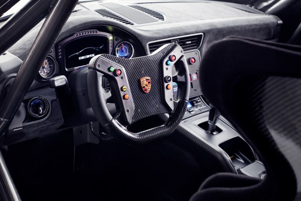 Interni esclusivi per questa Porsche 935. Volante ripreso dalla 911 GT3 R, pomello del cambio laminato in legno come per la Porsche 917. La strumentazione è tipica da gara, ripresa dalla 911 GT3 con indicatori di pressione e sovralimentazione. La Porsche 935 ha comunque mantenuto l’impianto di climatizzazione.
