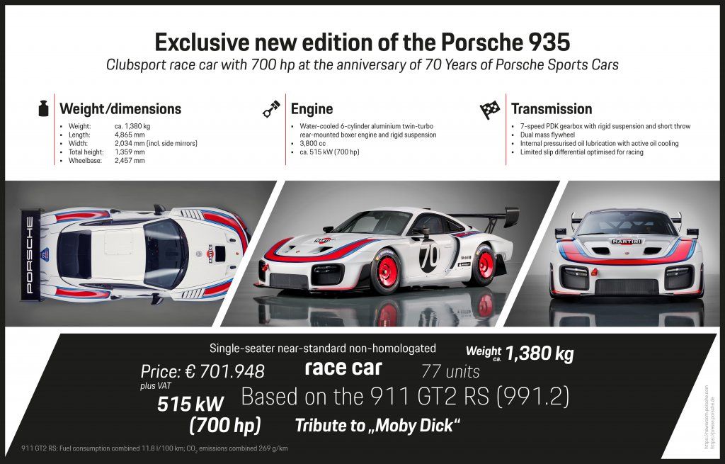 Rinasce la storica Porsche 935 “Moby Dick”. La celebre supercar che ala fine degli anni ’70 spopolava nelle corse. La riproposizione avviene per i 70 anni di Porsche. La nuova Porsche 935 sarà prodotta in soli 77 esemplari ad un prezzo indicativo di circa 710.000 euro (tasse escluse). Prime consegne ad inizio estate del 2019. Ecco il video promo ufficiale della nuova Porsche 935: