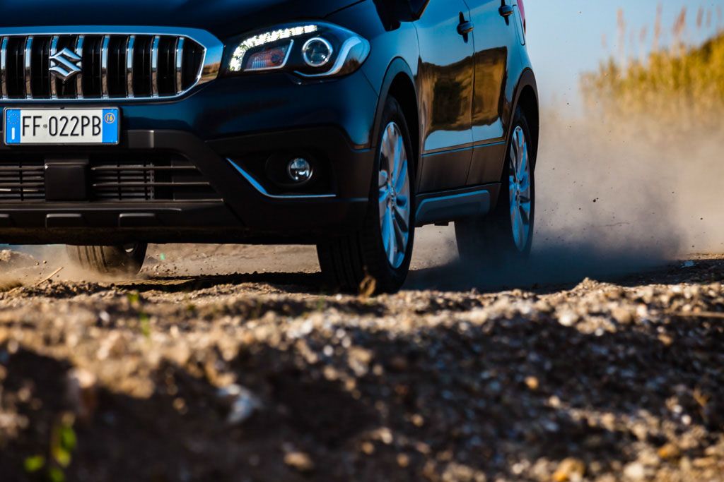 Le dimensioni compatte aiutano su strada, senza creare intralcio in fase di parcheggio o manovra e anche quando ci si muove in vie strette o comunque in passaggi austeri. La nostra S-Cross come detto è equipaggiata con il motore 1.6 turbodiesel da 120cv abbinato al cambio automatico con palette (molto reattivo ma non pensate di chiedere una cambiata da Formula 1 ) e alla trazione integrale Suzuki 4WD che offre quattro modalità di funzionamento regolabili attraverso una manopola nel tunnel: in Sport sfrutta al massimo il sistema 4×4 per migliorare la tenuta di strada, in Auto privilegia la trazione anteriore per contenere i consumi. Per i fondi scivolosi c’è il programma Snow, mentre nelle situazioni in cui serve la massima trazione si può bloccare il differenziale centrale (posizione Lock) per avere la coppia equamente ripartita fra i due assi anteriore e posteriore.